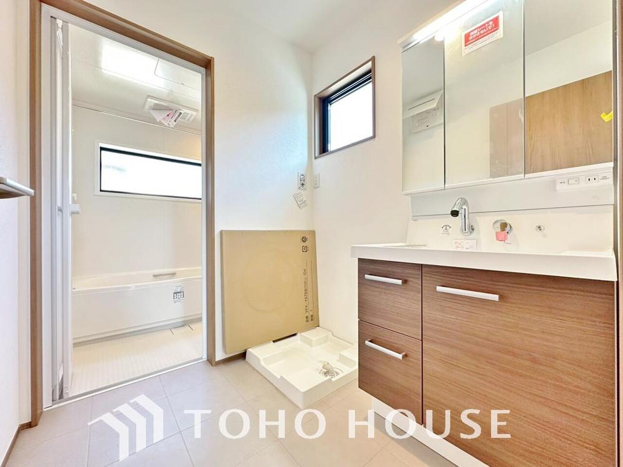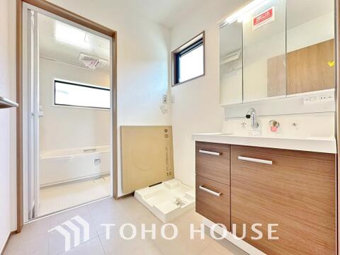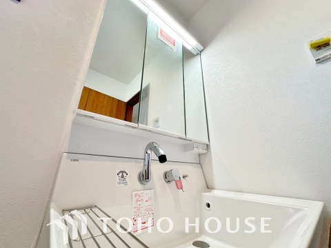 洗面台には三面鏡を採用。鏡の後ろに収納スペースを設ける事により洗面台周りもすっきりします。