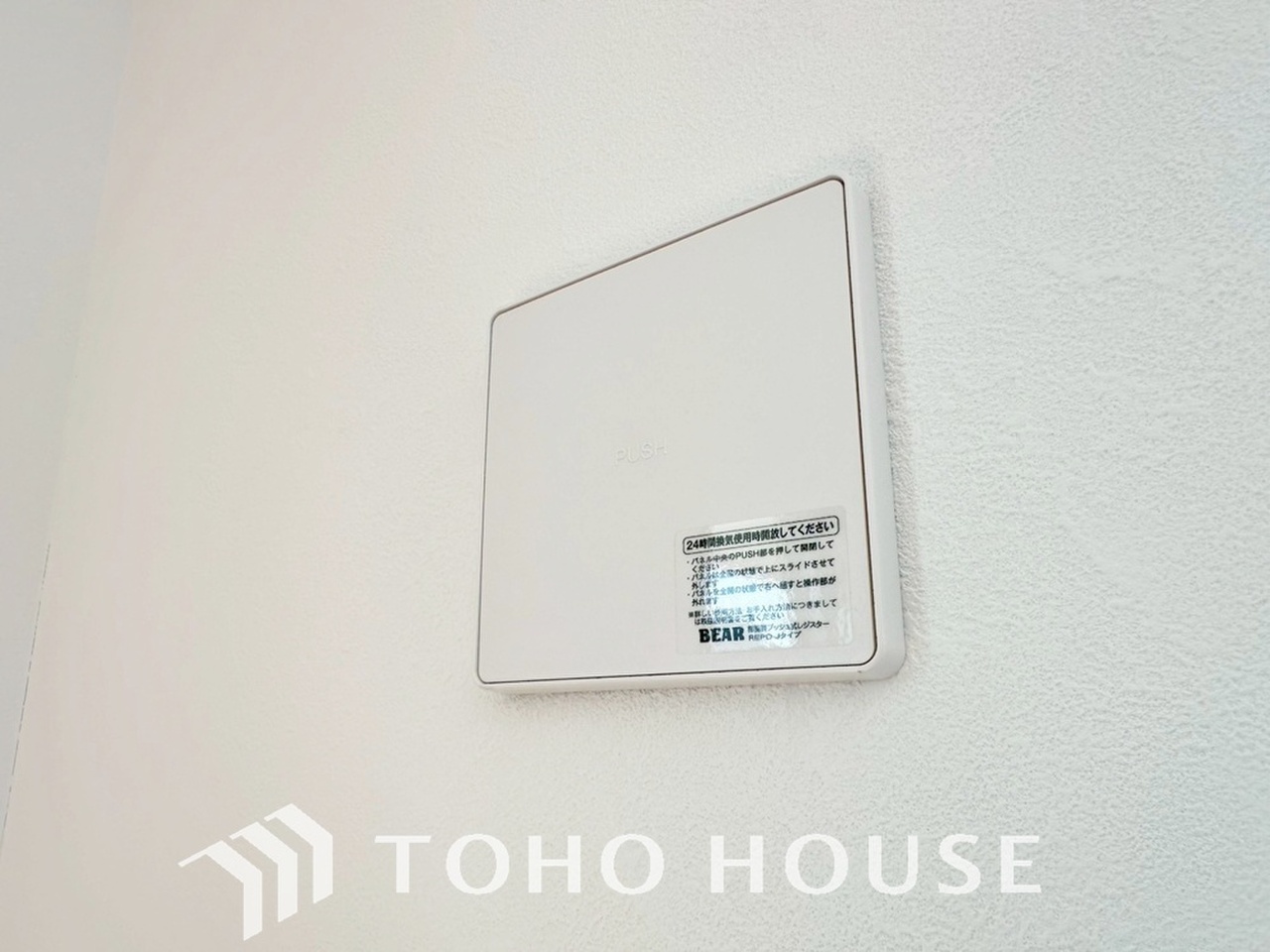 「24時間換気システム」24時間換気を行う呼吸をする家。小屋裏と壁体内の強制的な換気も同時に行っており、建物の構造体の中の湿気も戸外に排気して建物の耐久性を高める役割も担っています。