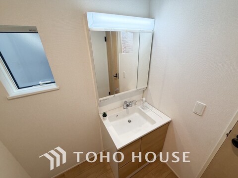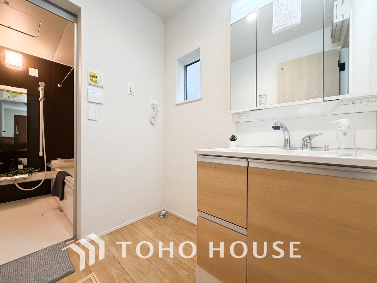 洗面台には三面鏡を採用。鏡の後ろに収納スペースを設ける事により洗面台周りもすっきりします。