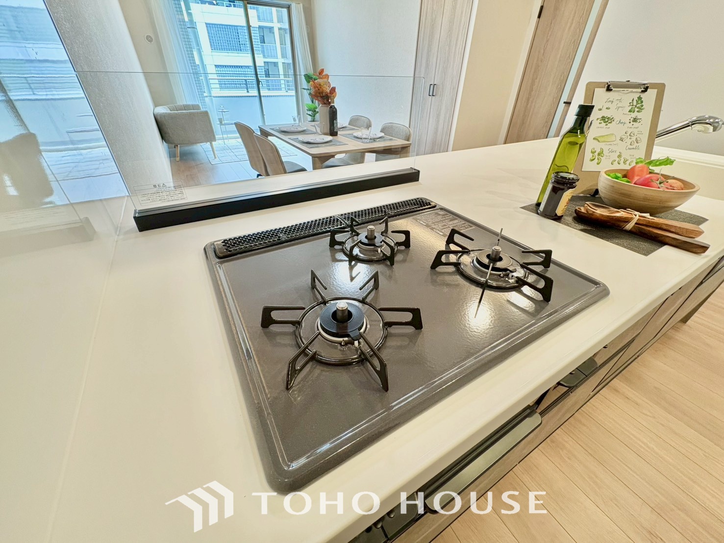 3口コンロは一度に複数のお料理を作ることができるメリットがあります。毎日のキッチンタイムを効率よく。