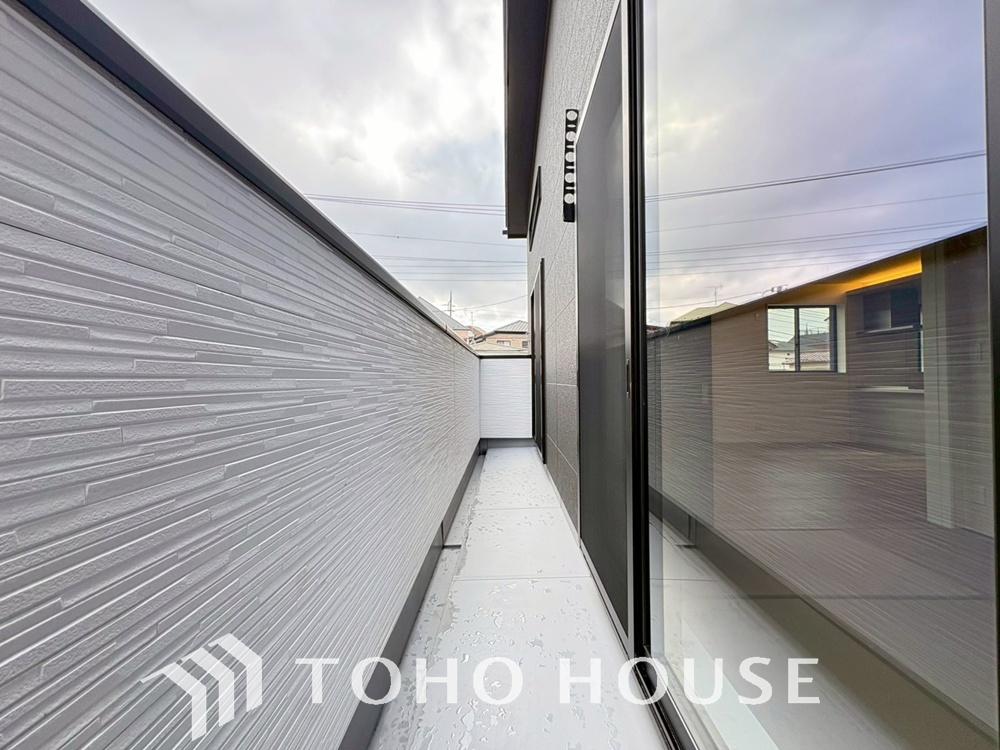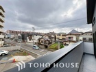 青空を感じられるバルコニーには爽やかな風が吹き抜け、周辺には戸建住宅街の景色が広がります。