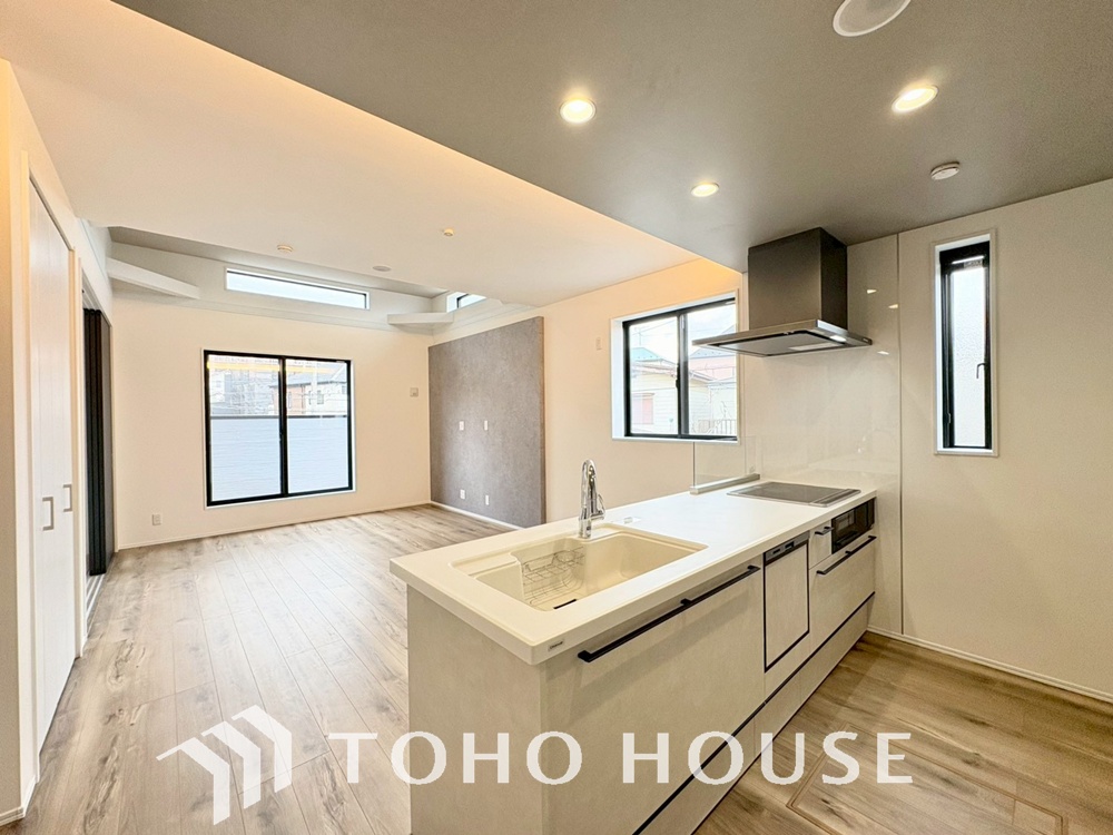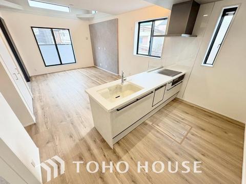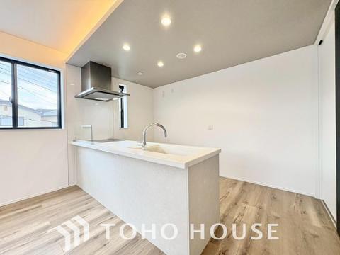 キッチンは、リビングで寛ぐ家族や小さなお子様を見守りながら料理が出来る対面式の温もり設計。
