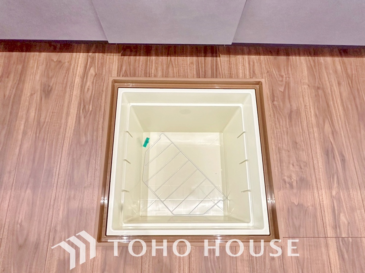 キッチンの収納は、デッドスペースになりやすい箇所を有効活用できる、スライド式収納を採用しました。