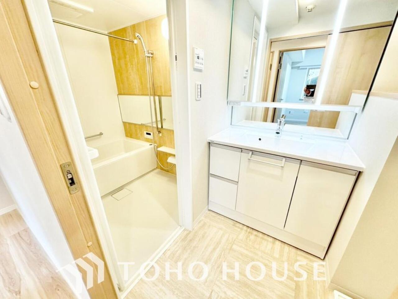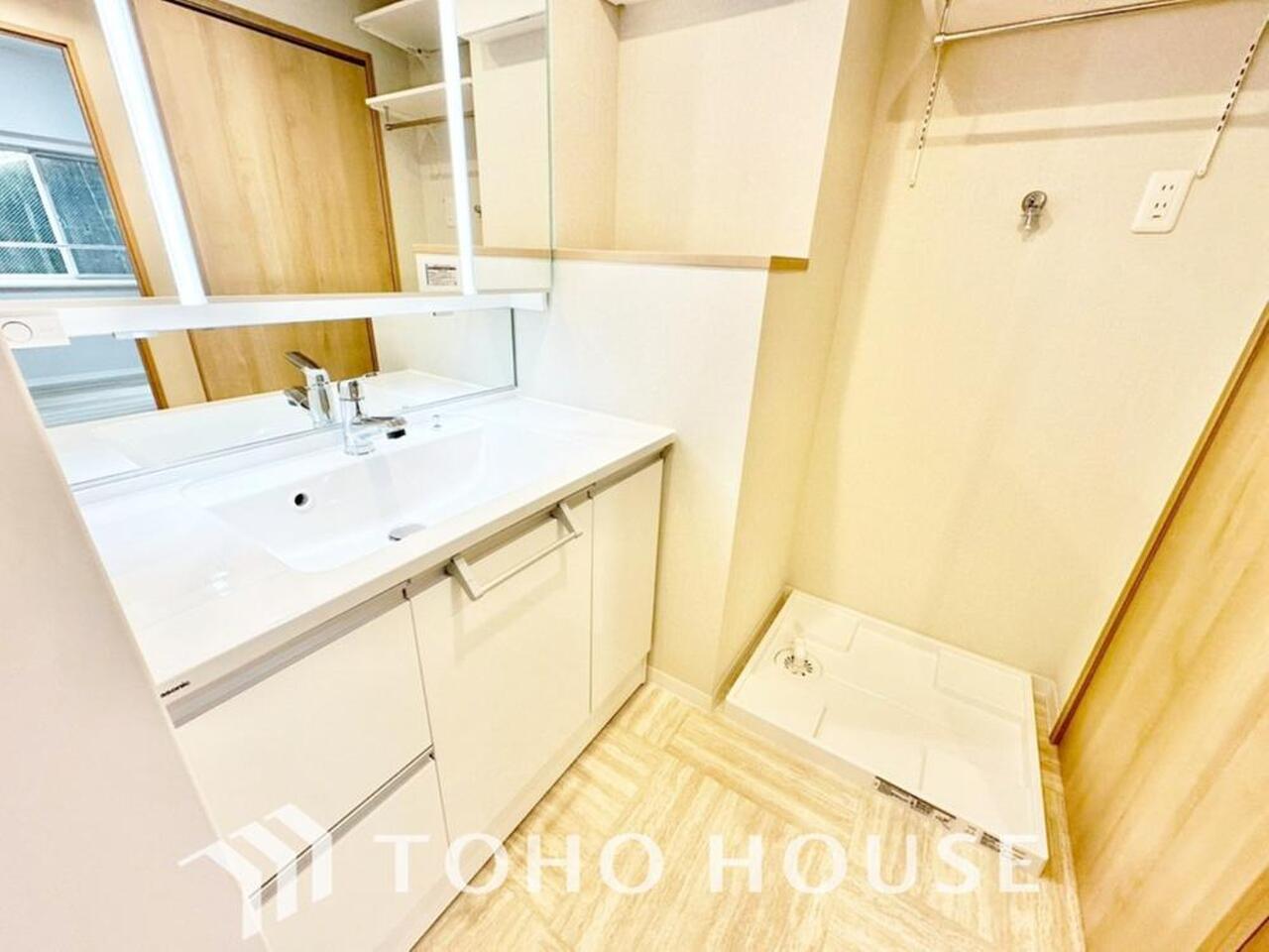 身だしなみのチェックがしやすい大きな鏡、下には収納がたっぷり。スッキリとした空間を演出いたします。
