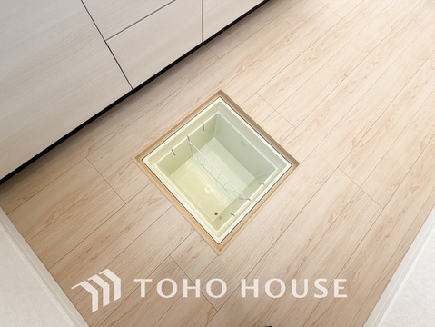 キッチン下部に設けた床下収納。缶詰のストックや非常食、梅酒や味噌などの保存食入れとして利用可です。