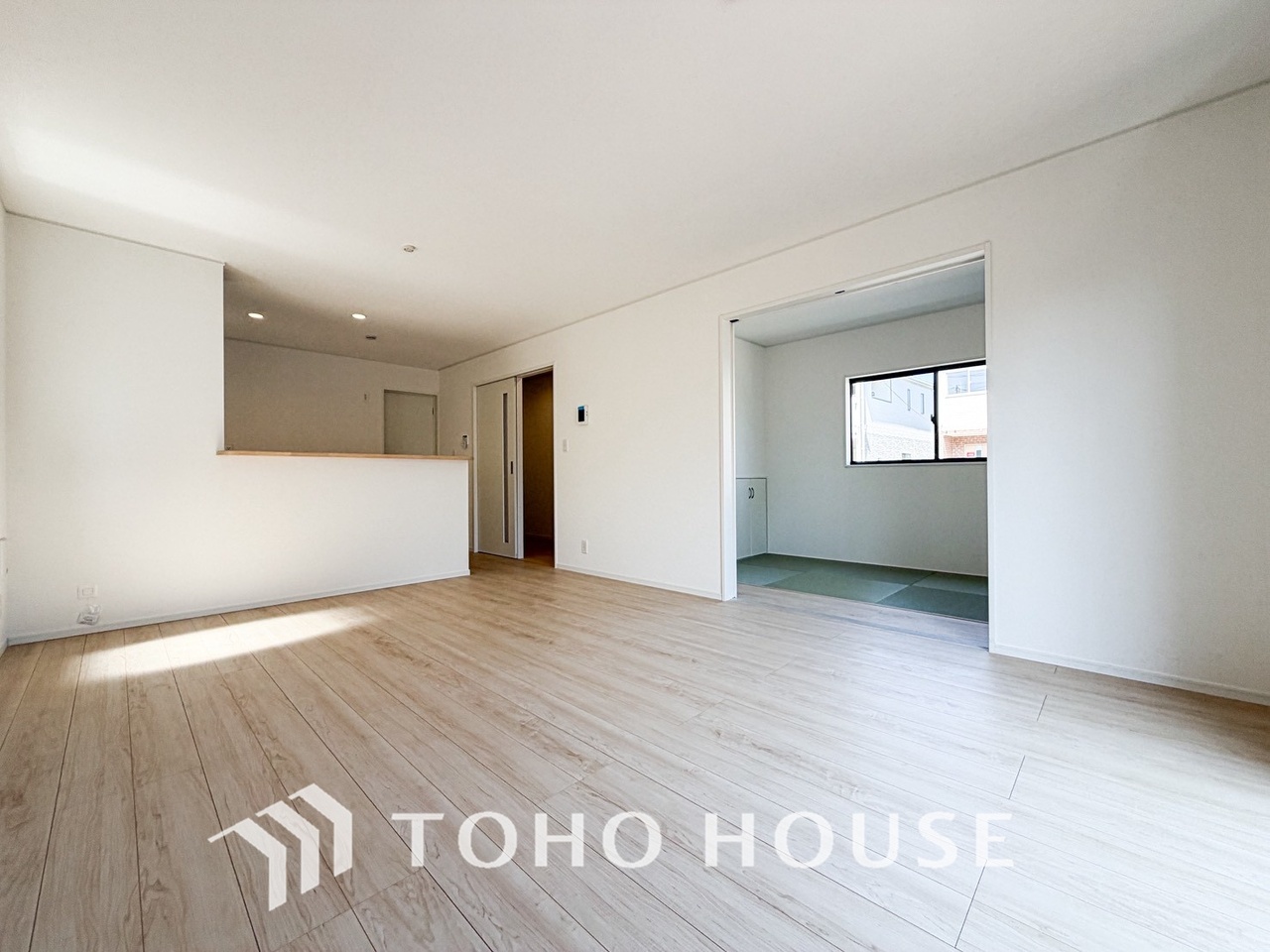 広々した開放感あるリビングの中にある癒しの和空間。家族団らんの場に和のテイストが自然にマッチ。