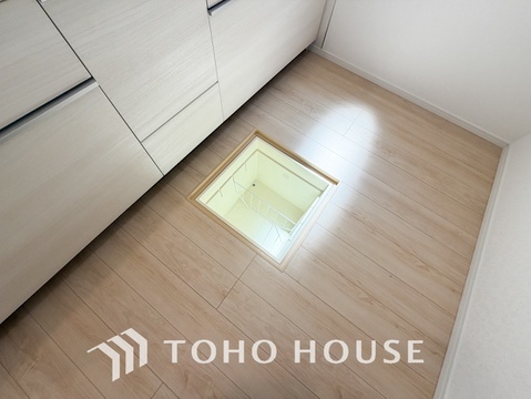 キッチン下部に設けた床下収納。缶詰のストックや非常食、梅酒や味噌などの保存食入れとして利用可です。