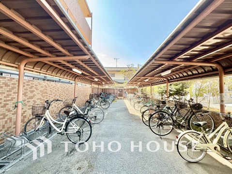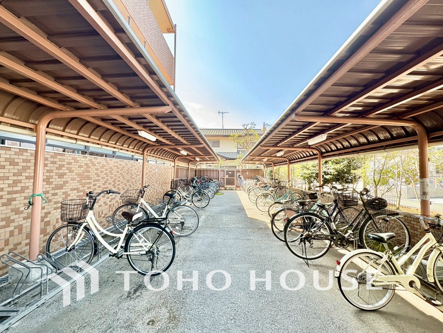共用部の駐輪場は雨除けが設置されています。きちんと整理され管理の行き届いた印象です。