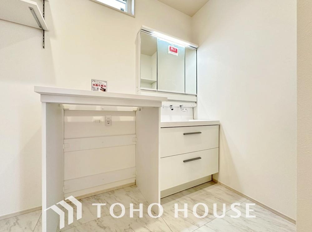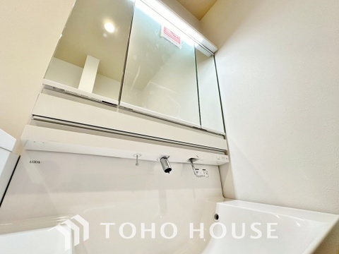 洗面台には三面鏡を採用。鏡の後ろに収納スペースを設ける事により洗面台周りもすっきりします。