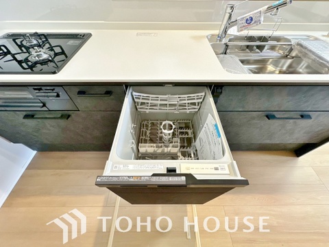 ビルトイン食器洗浄乾燥機付きのシステムキッチン。毎日の家事負担を軽減する嬉しい設備です。