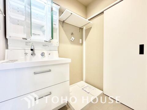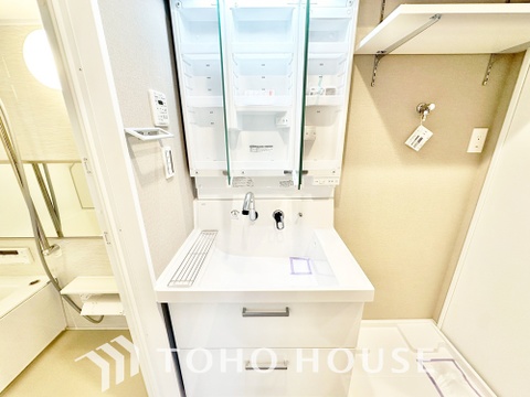 洗面台には三面鏡を採用。鏡の後ろに収納スペースを設ける事により洗面台周りもすっきりします。