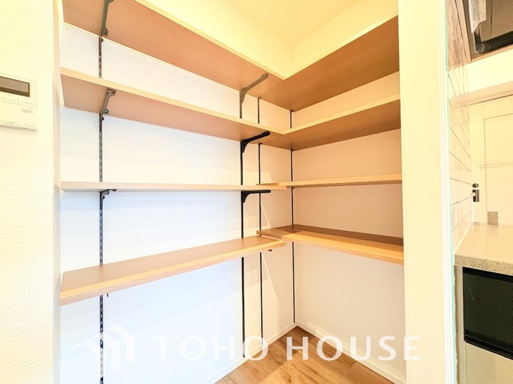 キッチン横にはパントリーを完備。ついつい買いすぎてしまった日用品や食料品のストックなどに。