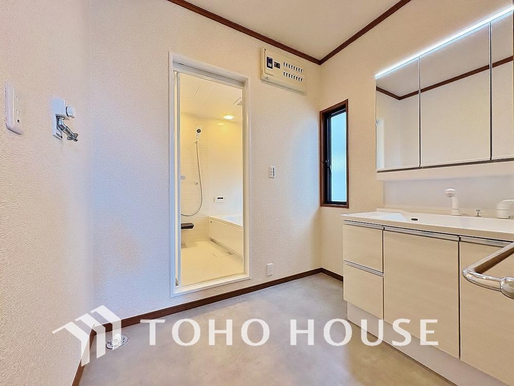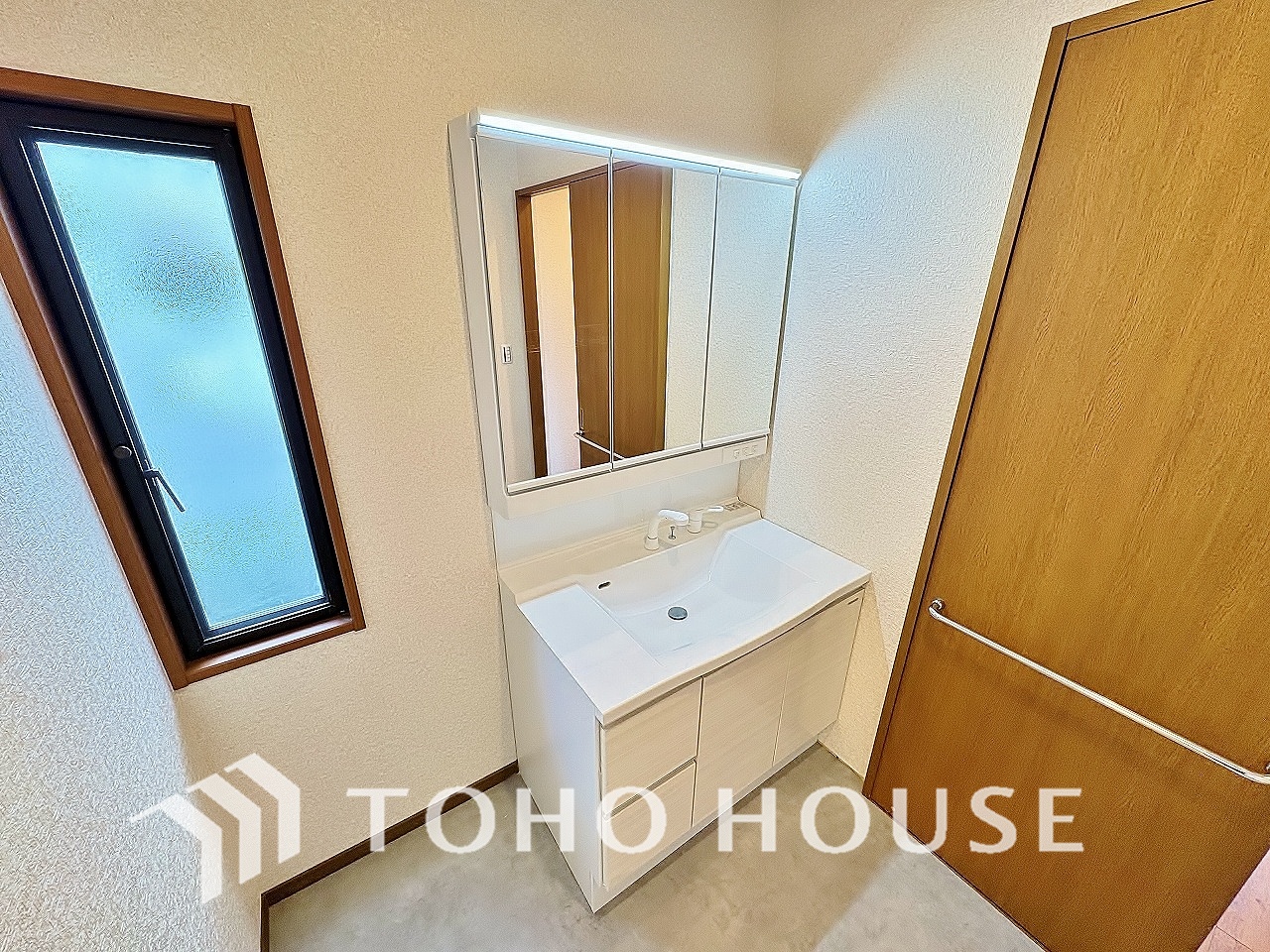 洗面台には三面鏡を採用。鏡の後ろに収納スペースを設ける事により洗面台周りもすっきりします。