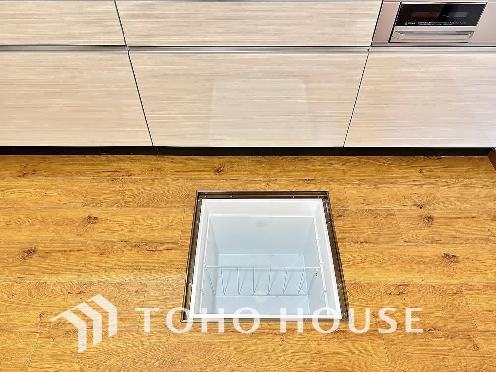 キッチン下部の床下収納は、保存食や季節家電の収納に便利で、点検口の役割も果たします。