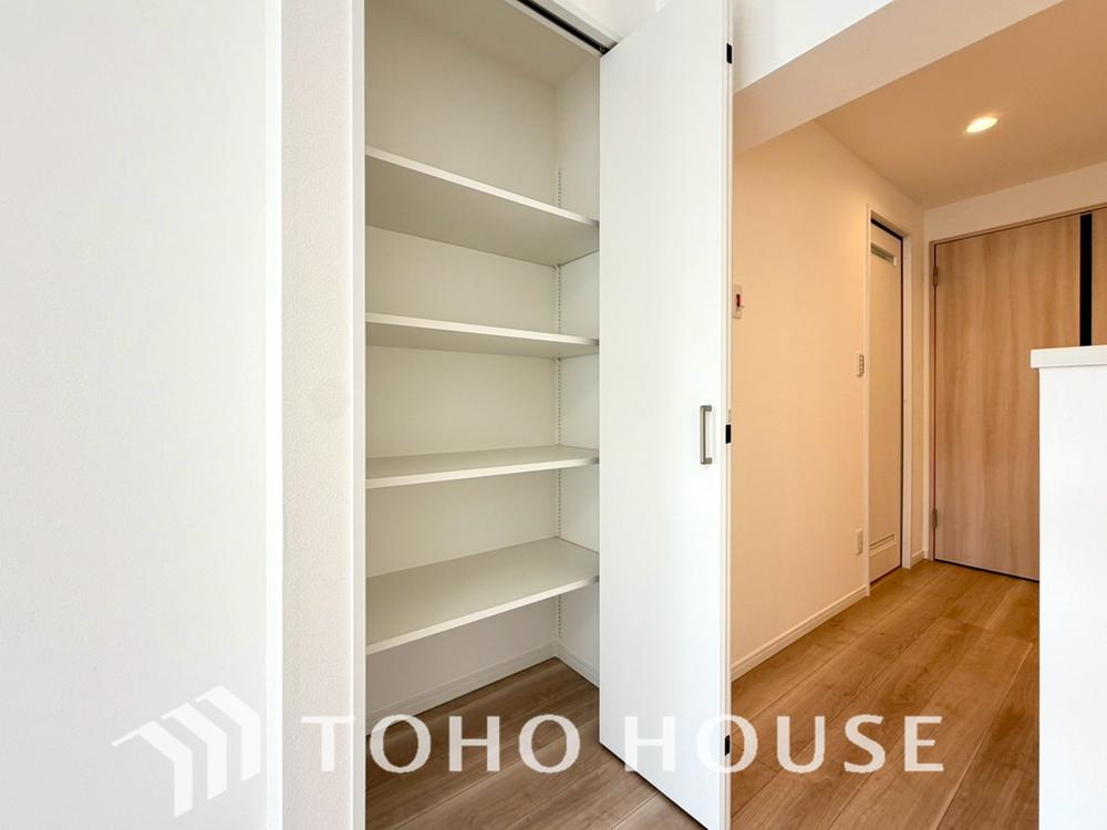 タオルや着替え、洗剤等の日用品を収納する事が出来るように、収納棚を設けております。