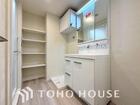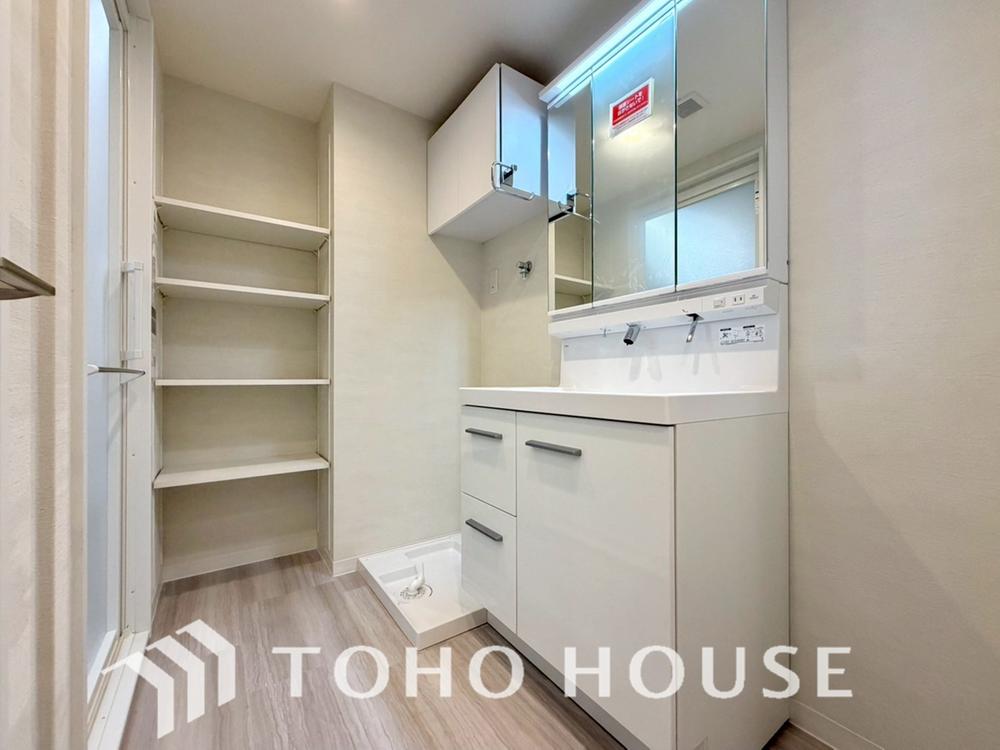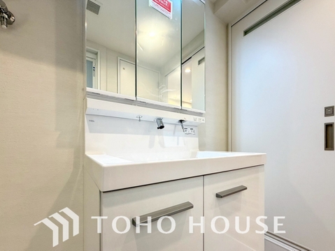 三面鏡のついた洗面台は身だしなみを整えたり見せない収納を確保できたり何かと便利。