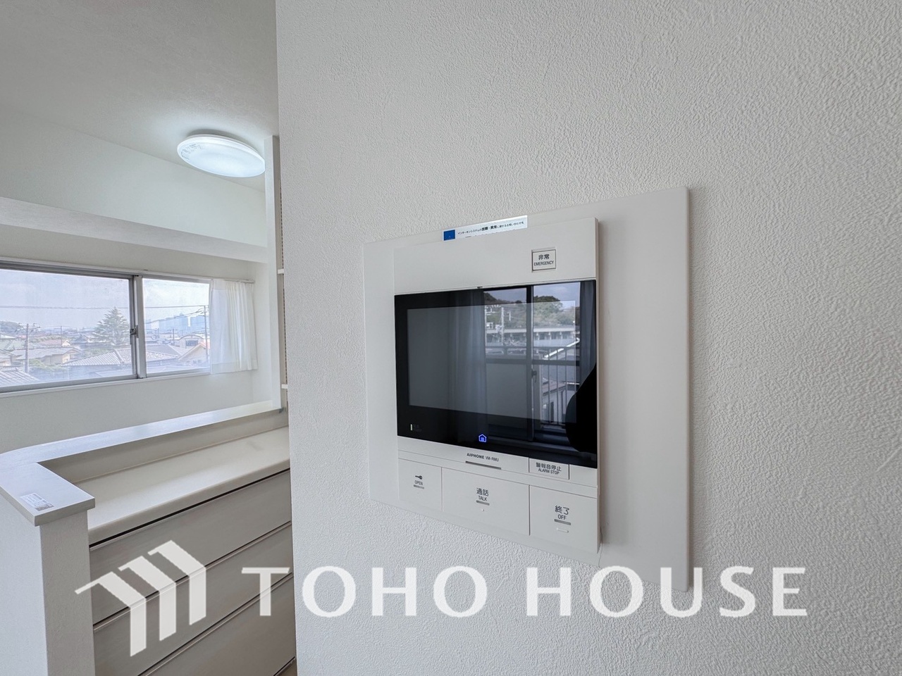 誰が来てもわかる様にモニター付きインターホンを設置。家事導線を考慮した個所に設置し、防犯性と利便性に優れ快適と安らぎを合わせた優しい設計。