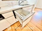 キッチンの収納は、デッドスペースになりやすい箇所を有効活用できる、スライド式収納を採用しました。