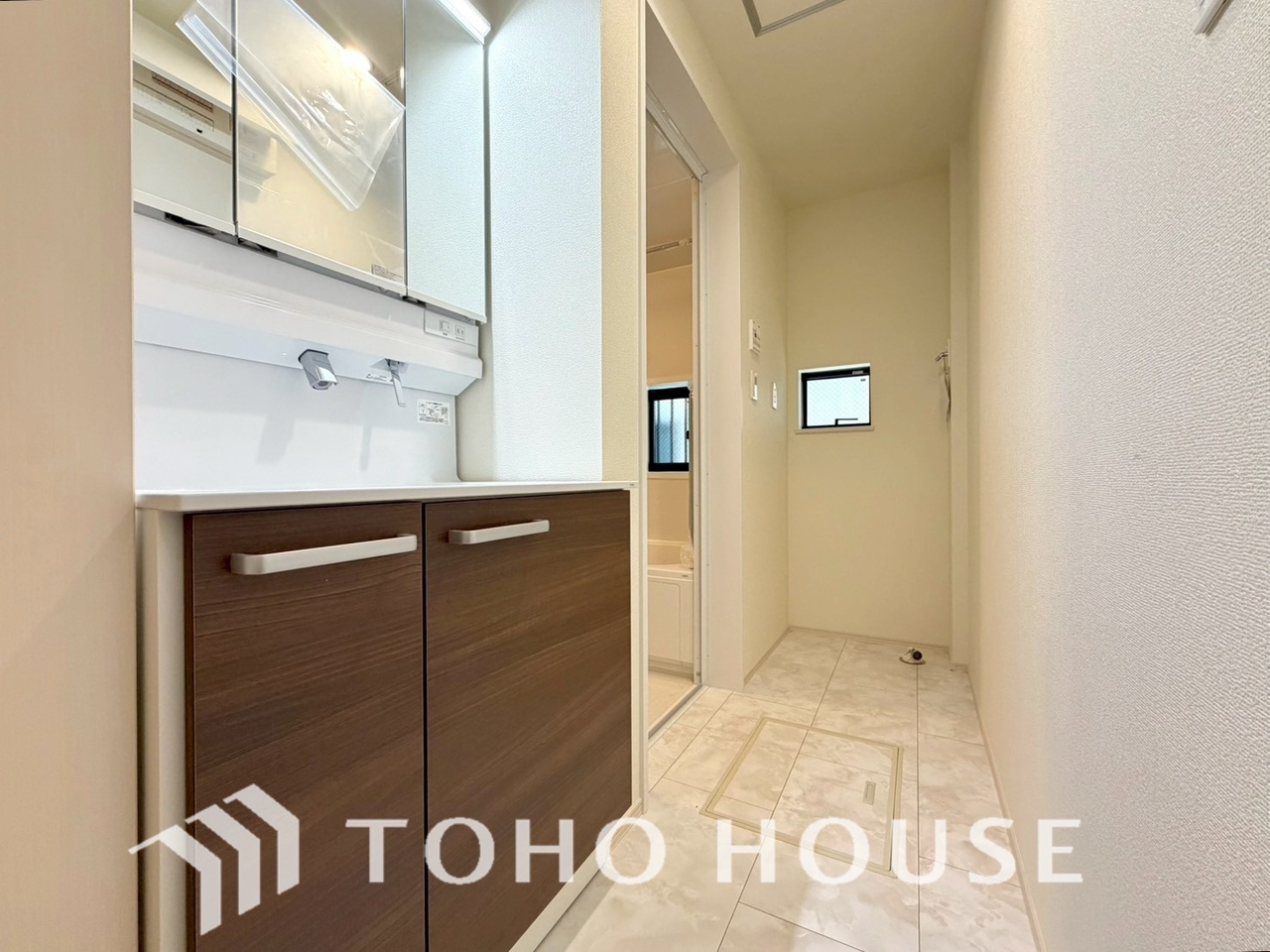 洗面台には三面鏡を採用。鏡の後ろに収納スペースを設ける事により洗面台周りもすっきりします。