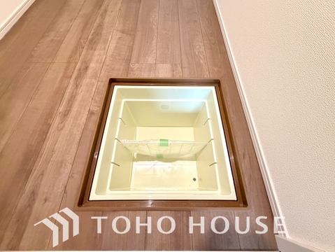 スペースを上手く活用した床下収納はあると何かと便利。食料のストック品はもちろん、掃除用具など。