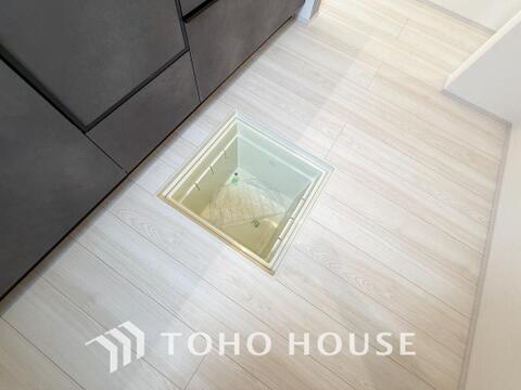 「床下収納」キッチン下部に設けた床下収納は、食品のストックや非常食、保存食の保管庫・収納庫として活用できます。また、住まいの診断・点検時には床下点検口としての役割もあります。