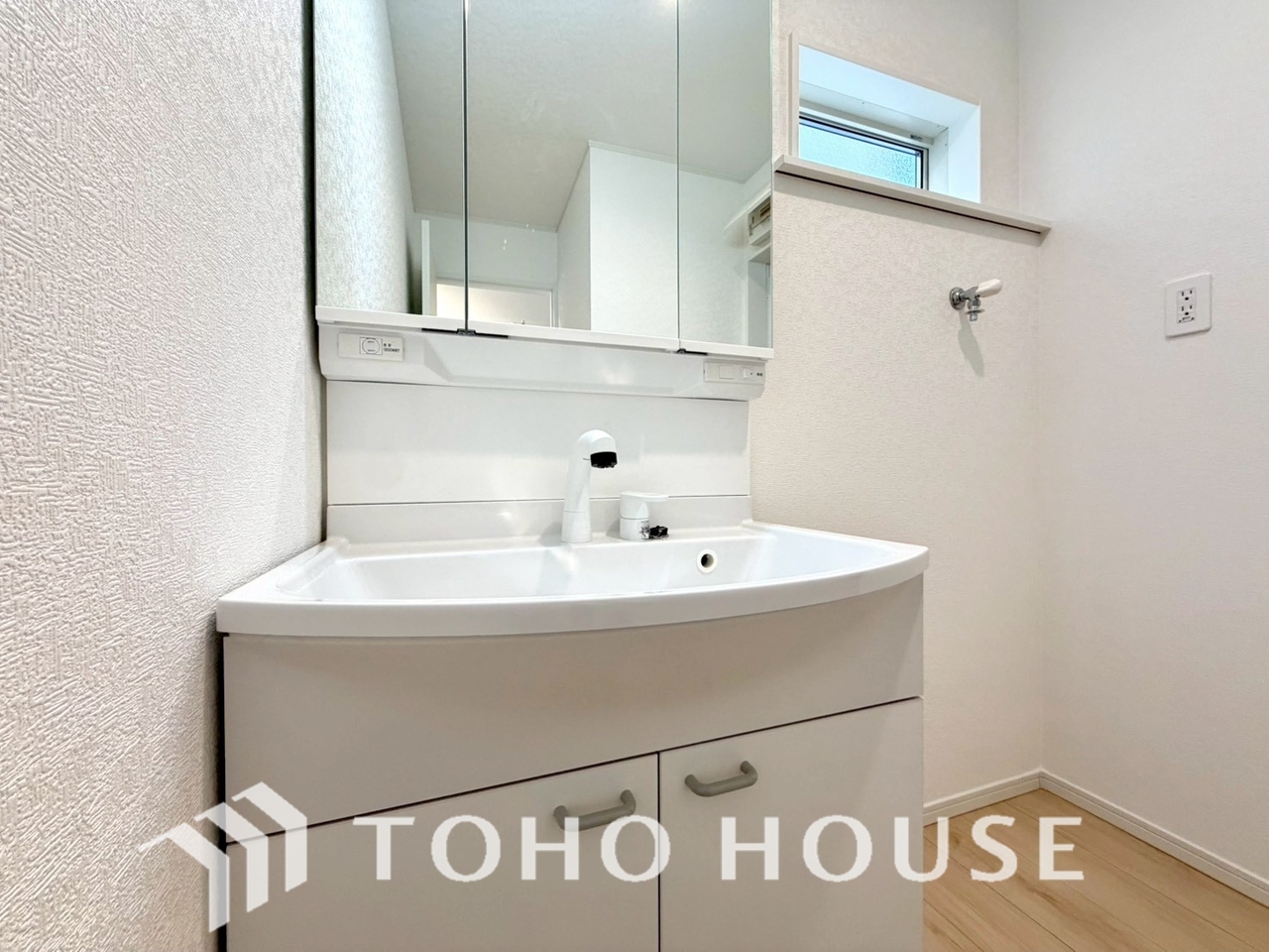 三面鏡のついた洗面台は身だしなみを整えたり見せない収納を確保できたり何かと便利。