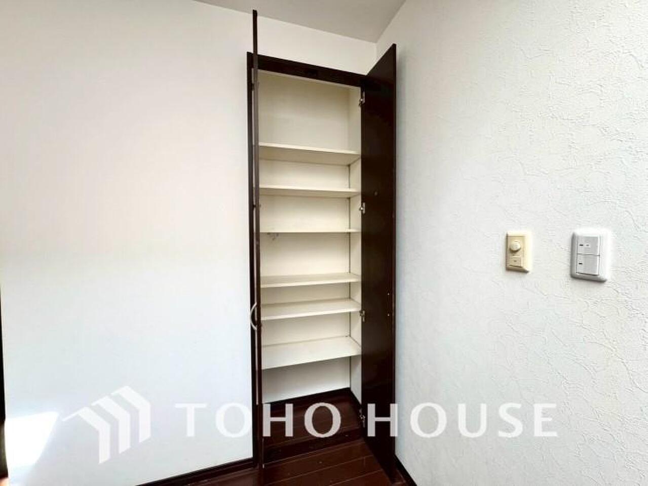 玄関そばの廊下収納。日用品のストックや防災グッズを置いたりと、何かと便利に使えます。