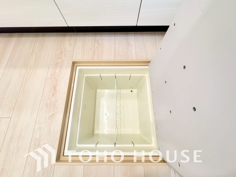 キッチン下部に設けた床下収納。缶詰のストックや非常食、梅酒や味噌などの保存食入れとして利用可です。