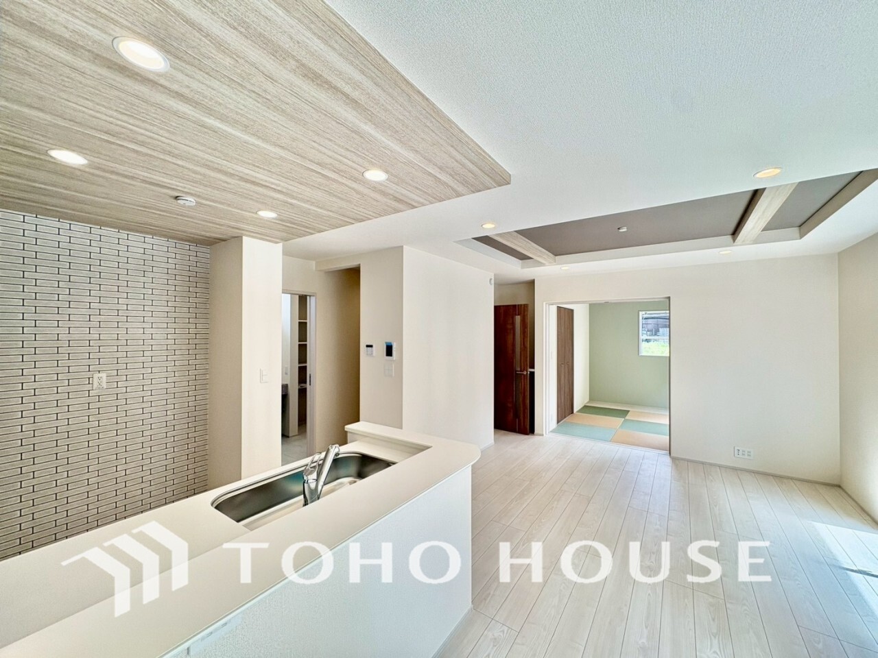 広々した開放感あるリビングの中にある癒しの和空間。家族団らんの場に和のテイストが自然にマッチ。