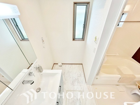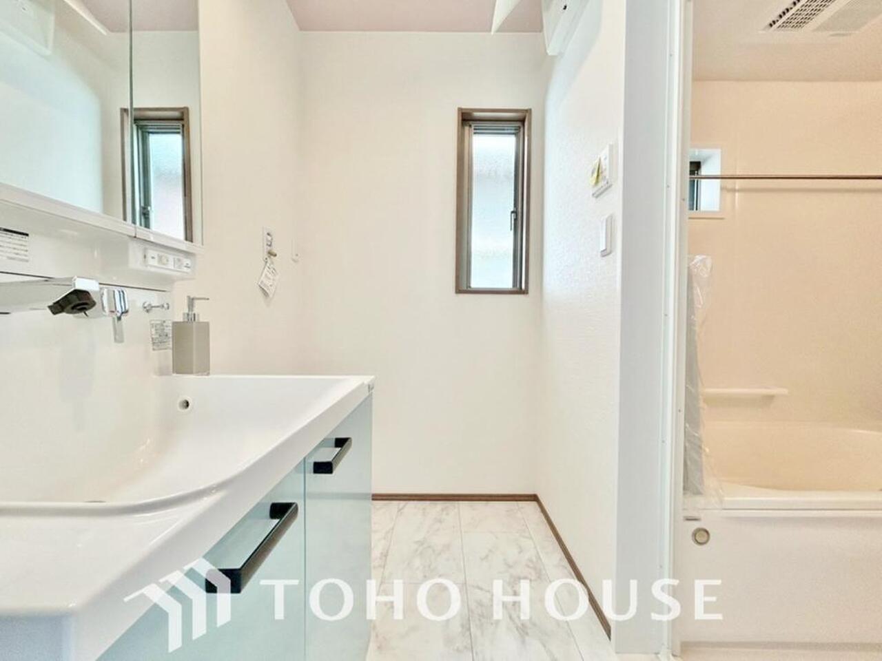 お家の中でも特にプライベートスペースとなる洗面所は、洗濯場所と浴室を同じ空間でまとめております。