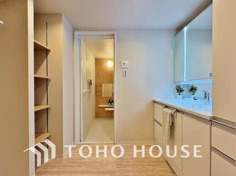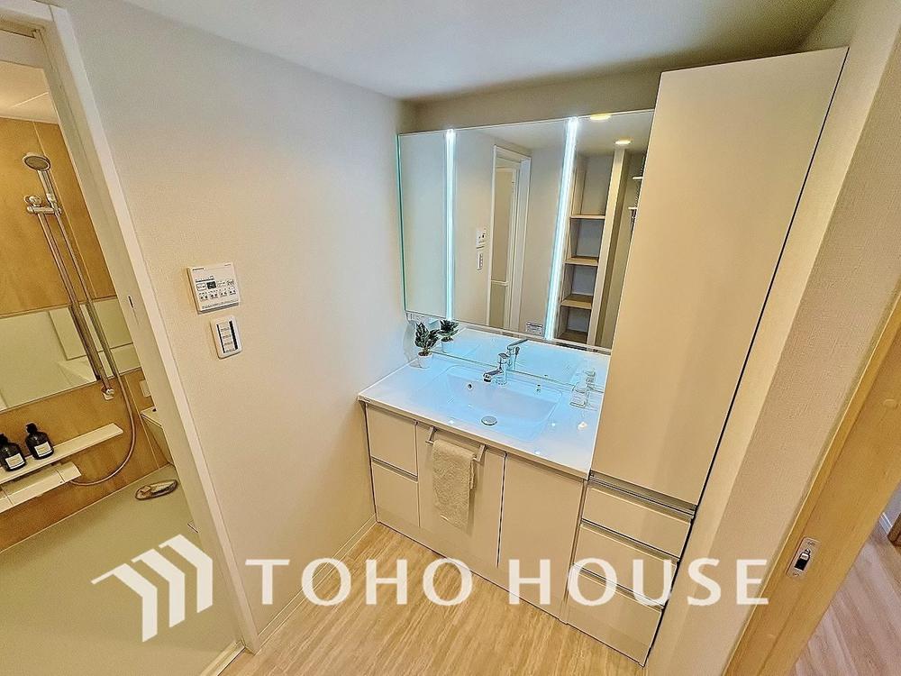 身だしなみのチェックがしやすい大きな鏡、下には収納がたっぷり。スッキリとした空間を演出いたします。
