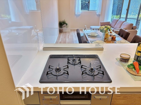 見た目に美しくインテリア性にも優れお掃除も簡単。3口コンロで忙しくても同時に調理で便利ですね。