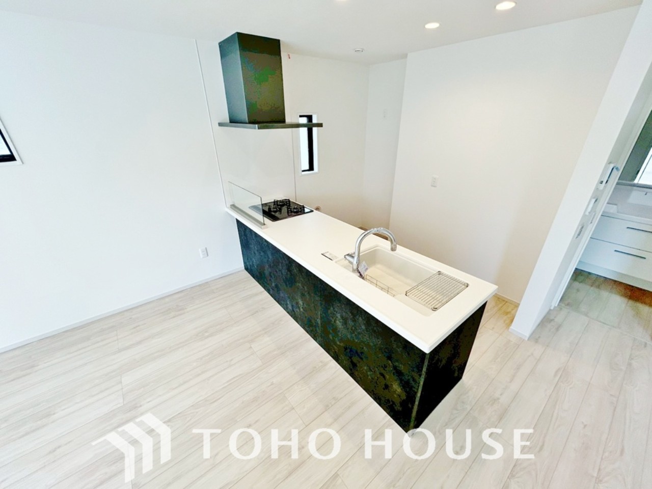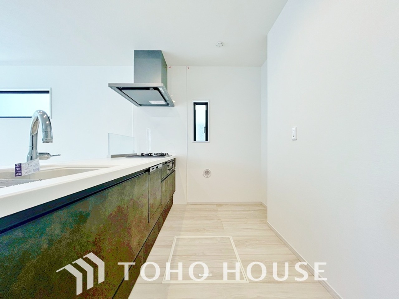 作業スペースを多くとった対面キッチン。夫婦そろってキッチンに立っても調理がしやすくゆとりある広さ。