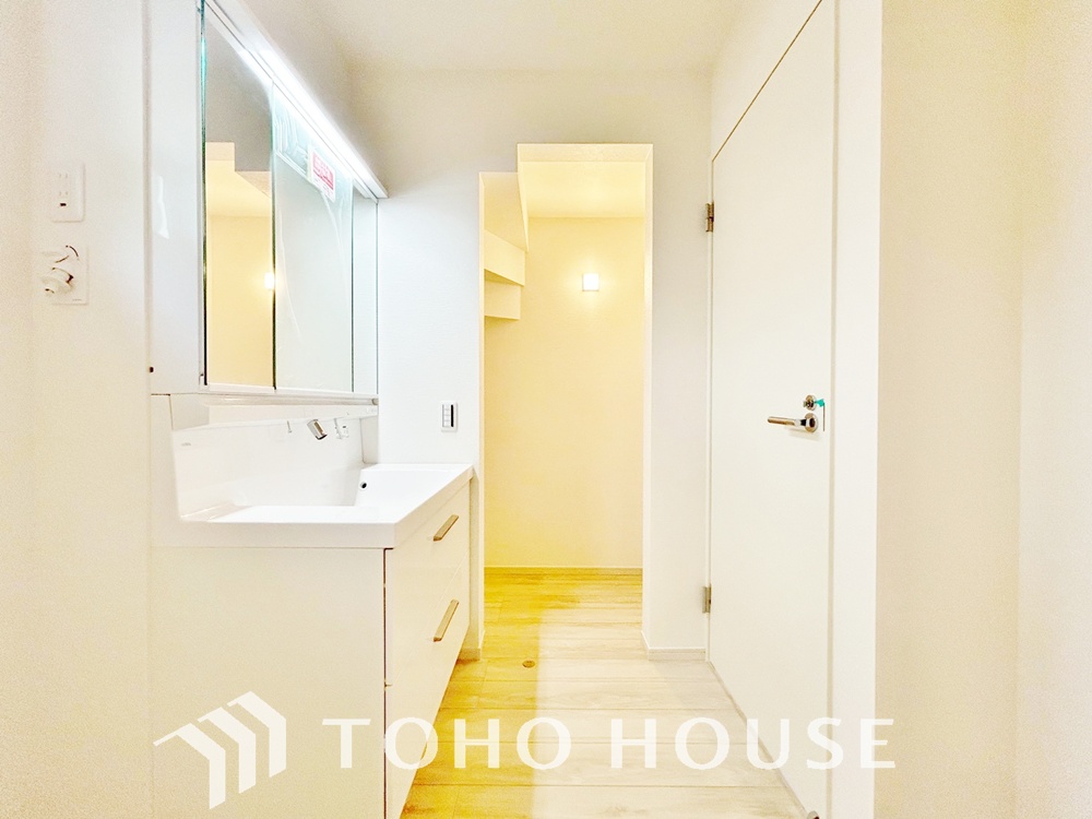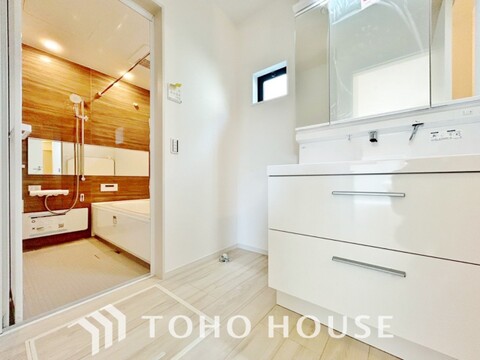 お家の中でも特にプライベートスペースとなる洗面所は、洗濯場所と浴室を同じ空間でまとめております。