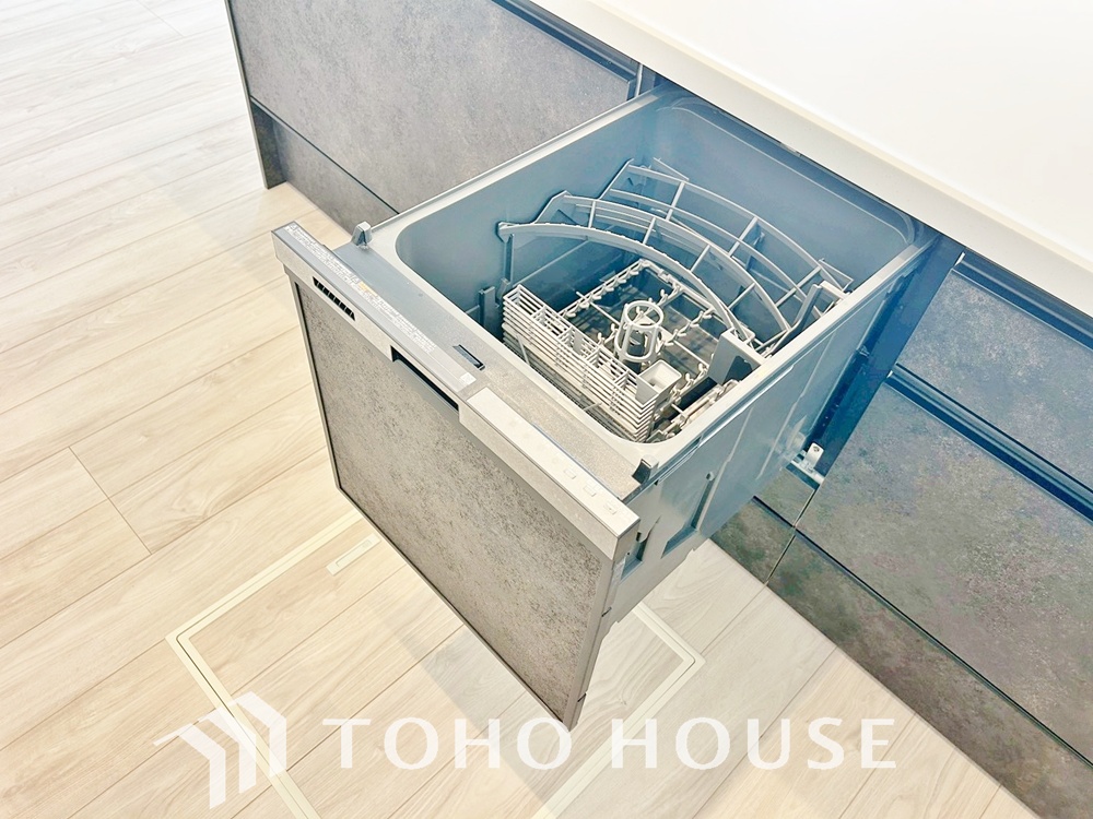 ビルトイン食器洗浄乾燥機付きのシステムキッチン。毎日の家事負担を軽減する嬉しい設備です。