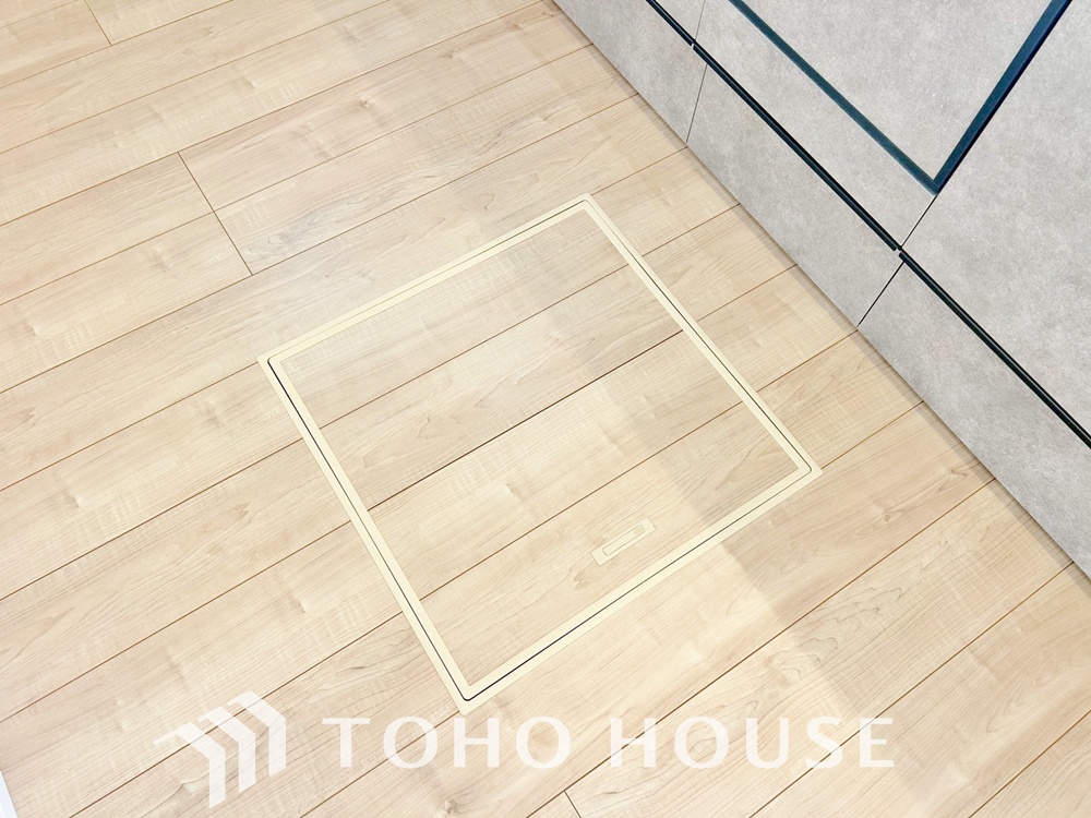 キッチン下部に設けた床下収納。缶詰のストックや非常食、梅酒や味噌などの保存食入れとして利用可です。