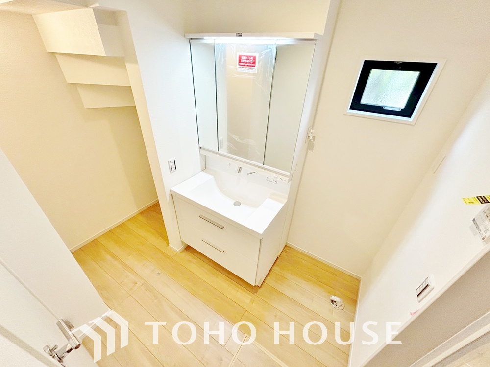 洗面台には三面鏡を採用。鏡の後ろに収納スペースを設ける事により洗面台周りもすっきりします。