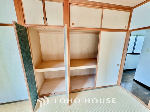 押入収納付です。お布団類は勿論のこと、奥行きを生かして普段使わないかさばる物を収納していただけます。