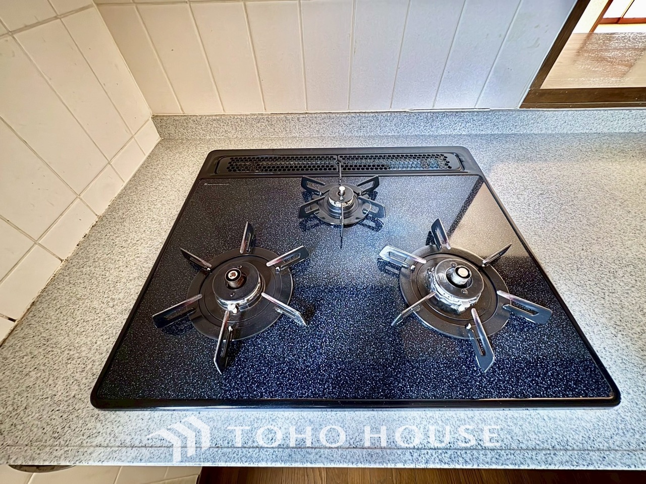 見た目に美しくインテリア性にも優れお掃除も簡単。3口コンロで忙しくても同時に調理で便利ですね。