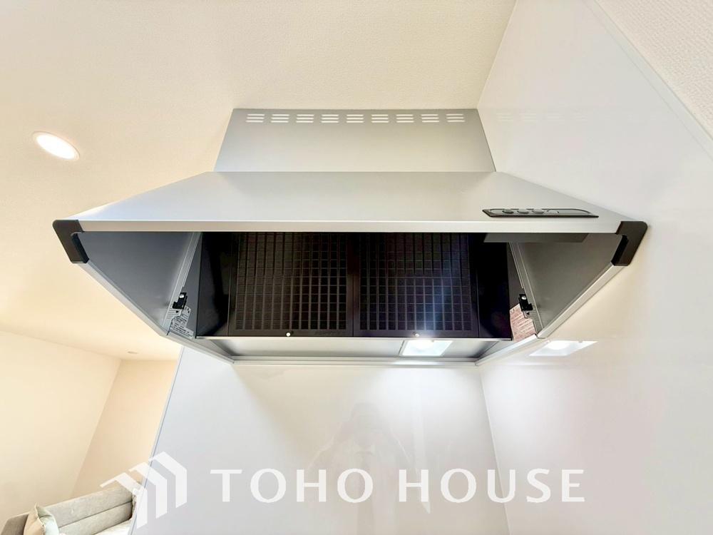 「レンジフード」見た目すっきりのスリムタイプのレンジフードが最近の流行りです。そのスタイリッシュな見た目からインテリアの一部としてもデザイン性が重視されています。掃除のし易さも◎。