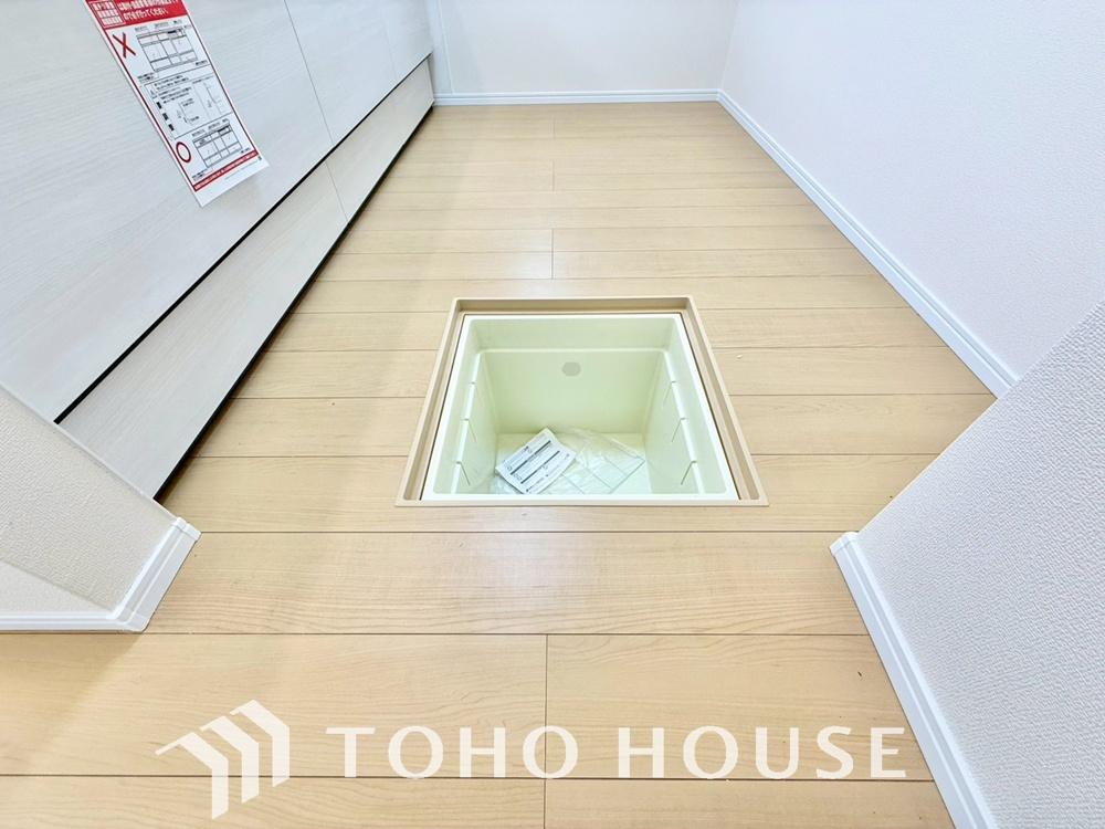 「床下収納」キッチン下部に設けた床下収納は、食品のストックや非常食、保存食の保管庫・収納庫として活用できます。また、住まいの診断・点検時には床下点検口としての役割もあります。