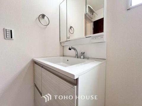 身だしなみのチェックがしやすい大きな鏡、下には収納がたっぷり。スッキリとした空間を演出いたします。