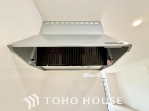 「レンジフード」見た目すっきりのスリムタイプのレンジフードが最近の流行りです。そのスタイリッシュな見た目からインテリアの一部としてもデザイン性が重視されています。掃除のし易さも◎。