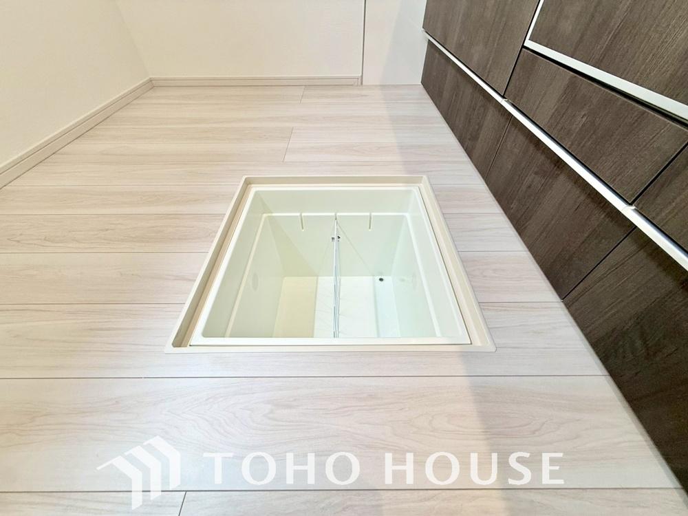 「床下収納」キッチン下部に設けた床下収納は、食品のストックや非常食、保存食の保管庫・収納庫として活用できます。また、住まいの診断・点検時には床下点検口としての役割もあります。
