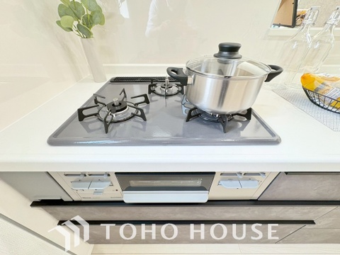 3口コンロは一度に複数のお料理を作ることができるメリットがあります。毎日のキッチンタイムを効率よく。