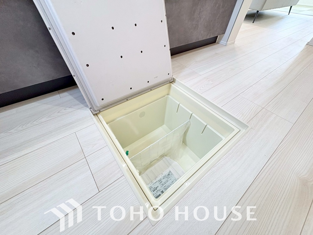 キッチン下部に設けた床下収納。缶詰のストックや非常食、梅酒や味噌などの保存食入れとして利用可です。