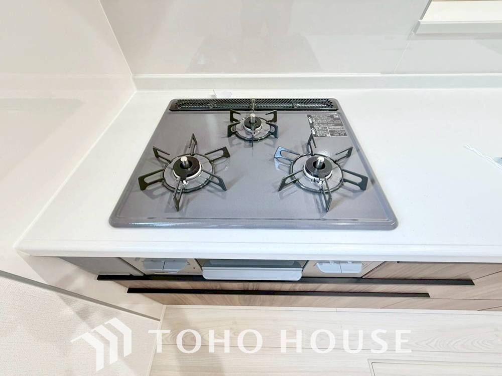 3口コンロは一度に複数のお料理を作ることができるメリットがあります。毎日のキッチンタイムを効率よく。