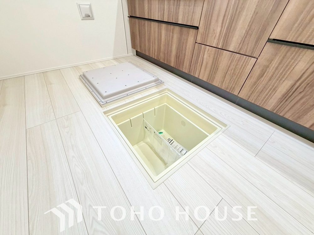キッチン下部に設けた床下収納。缶詰のストックや非常食、梅酒や味噌などの保存食入れとして利用可です。