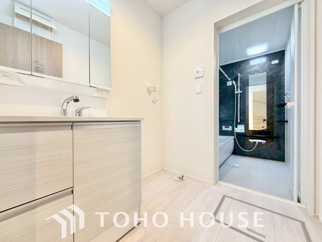 お家の中でも特にプライベートスペースとなる洗面所は、洗濯場所と浴室を同じ空間でまとめております。