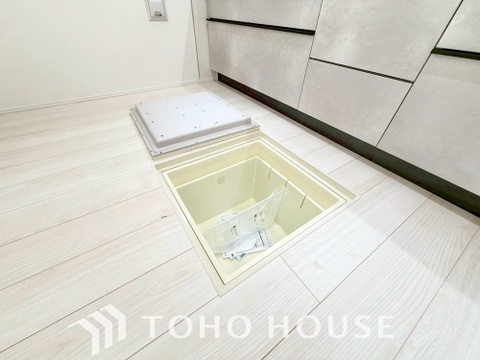 キッチン下部に設けた床下収納。缶詰のストックや非常食、梅酒や味噌などの保存食入れとして利用可です。